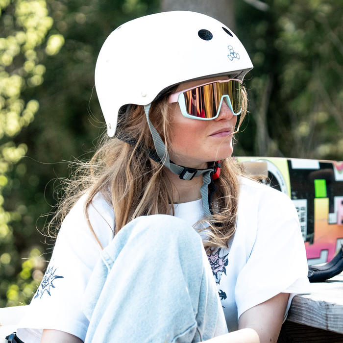 - Cat. 3 polycarbonate lens (visible light transmission rate: 12%) with colored mirror coating (Color Flash): improves filtration of visible light by applying a mirror effect to the lens. Multipurpose lens suitable for all uses.